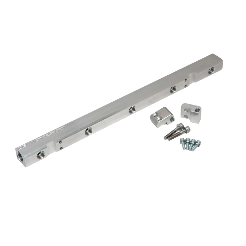 The 034 Motorsport Billet Aluminum Fuel Rail is specially designed for Audi's iconic 20-valve, 5-cylinder engines. This high-performance fuel rail is CNC machined billet aluminum, resulting in a strong, lightweight, and durable product that can withstand the demanding conditions of performance vehicles. The product is designed to meet standard EFI injectors to support, with O-ring seals for a perfect fit. The 034EFI logo is precision CNC machined on one side, which not only gives a professional appearance but also underlines the quality and craftsmanship of the product. The fuel rail offers flexible connection options and is suitable for use with -6AN, -8AN and -10AN fittings, making it easy to customize the fuel system to your specific needs. Each side of the rail is tapped for -8AN fittings, providing ample clearance for efficient fuel delivery. This configuration makes it ideal for both daily drivers and performance-oriented race cars. For vehicles equipped with a Wagner intake manifold, 3B/RS2 mounting brackets are recommended for proper and secure installation. The included hardware ensures a hassle-free installation and compatibility with Audi models equipped with 20-valve I5 engines.