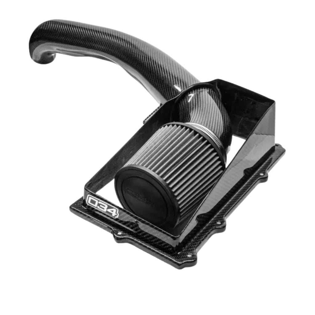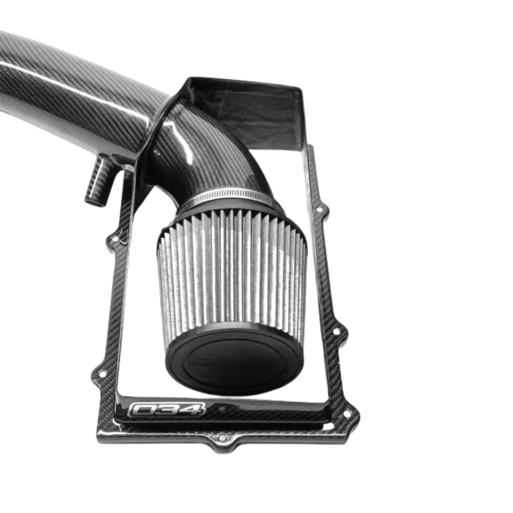 The X34 Carbon Fiber Cold Air Intake System has been specially developed for the 2015 - 2017 Audi RS3 2.5 TFSI (8V) and is only suitable for vehicles not sold in the US. This high-performance air intake system offers significant performance benefits. It delivers up to 14 hp and 10 ft-lbs of torque more than standard turbo settings. This not only means an increase in power but also an improved driving experience with greater throttle response. 034 Motorsport has paid close attention to the design of this air intake. By using advanced technologies such as CFD analysis and 3D scanning, a carbon fiber intake hose was developed that is a direct replacement for the factory plastic pipe. This ensures optimal airflow, even with the space limitations of the engine bay. The X34 Cold Air Intake System It is equipped with a carbon fiber heat shield that allows the high-flow conical filter to inhale cooler, denser air. This is crucial because air temperature directly affects engine performance. The heat shield fits perfectly against the factory air filter housing and prevents warm air from the engine compartment from reaching the intake. Furthermore, the filter housing's design carefully considered the airflow around the filter. This ensures free airflow in and out, improving overall performance. Many aftermarket kits fail in this regard, but 034 Motorsport has thoroughly tested and resolved this issue. As for aesthetics, the carbon fiber finish was carefully chosen to perfectly match the factory carbon fiber trim of the Audi RS3. This creates an OEM+ look that is both functional and visually appealing.