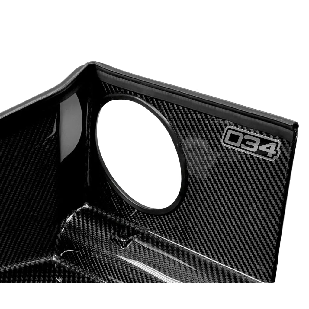 The S34 Carbon Fiber Intake for the Volkswagen Mk8 Golf GTI is an advanced performance upgrade designed for the EA888 Gen 4 Turbocharged 2.0T engine. This intake not only delivers a significant increase in power and torque, but also improves the engine sound and overall driving experience. The purpose of the S34 Carbon Fiber Intake is to offer an attractive, efficient, and cost-effective solution for car enthusiasts who want to take their vehicle to the next level. Great attention to detail was paid in the development of this intake S34 Carbon Fiber Intake Delivers measurable performance through an optimized open-air box design, which utilizes the factory-fresh air intake to direct cooler outside air into the engine. This large air box is equipped with a generous 4-inch Conical air filter, free from restrictive shrouding. This allows air to flow smoothly through the CFD-optimized 4-layer silicone intake manifold, resulting in increased airflow to the throttle body. 034 Motorsport has focused on minimizing unnecessary airflow restrictions. This is essential for a well-performing intake system. In many aftermarket systems, the air filter is often too large for the housing, which restricts airflow. 034Motorsport has conducted extensive testing to create the ideal filter size and housing, ensuring maximum airflow and optimal performance with OEM-level filtration. The S34 Carbon Fiber intake incorporates a high-quality conical air filter with a double layer of pleated cotton, capable of trapping even the smallest particles down to 5 microns, while maximizing airflow. This system guarantees not only improved performance but also excellent filtration, even with power outputs up to 800 hp.