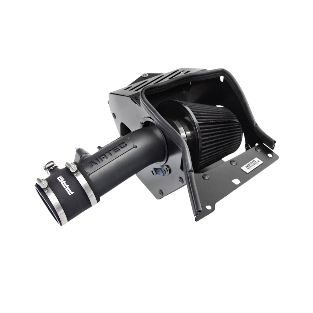 The free-flowing kit replaces the original air filter box and restrictive intake system. Featuring a large Airtec Motorsport cotton filter, it significantly improves airflow, resulting in more power, better performance, and a louder intake sound. The filter is protected from warm air from the engine compartment by a laser-cut heat shield that seals tightly against the hood and utilizes the original air intake to bring in fresh, cold air.