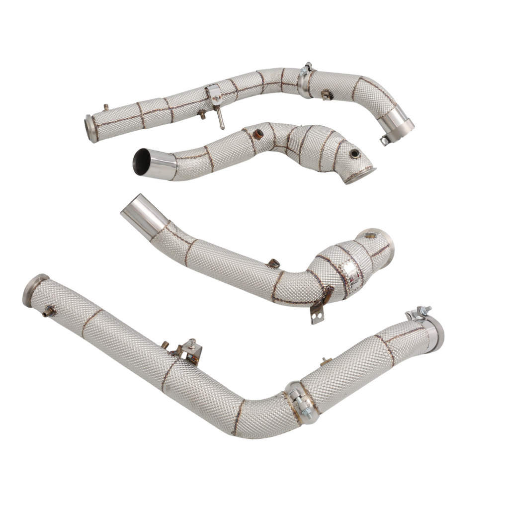 The downpipe is complete plug & play and provided with ball joint couplings for a perfect and flexible connection to the original exhaust system. Made of high-quality T304 stainless steel and Stainless steel TIG-welded for maximum durability and a smooth finish. The integrated Stainless steel heat shield keeps the engine compartment cool and protects surrounding components from extreme heat.